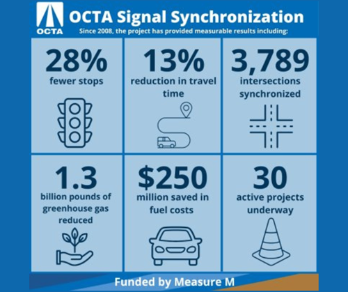 OCTA, in partnership with local cities, the County of Orange and Caltrans, continues to expand its Regional Traffic Signal Synchronization Program that improves traffic flow, reduces congestion, and enhances air quality.
